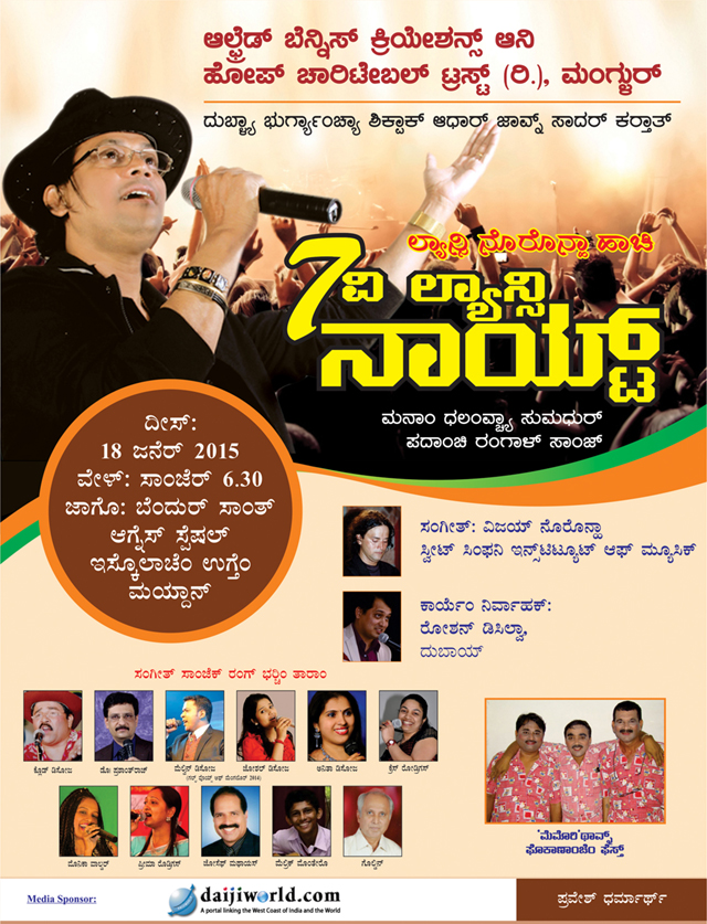 A large number of cheerful music enthusiasts were entertained to the full as Alfred Bennis Creations presented ‘Hope Baila Show’ at St Agnes Special School Ground on Sunday, January 27. The show, led by Vishwa Konkani Kala Rathna Eric Ozario was a mixture of attractive songs and dance. More than 50 artistes of Guinness record team of Mandd Sobhann, including 22 famous singers, nine accomplished musicians, and 15 Baila dancers performed in the show. The show was organized by Alfred Bennis for the aid of Hope Charitable Trust (R).